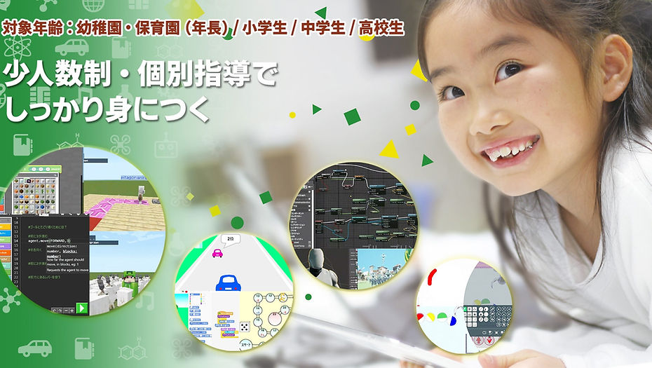 5歳からアルゴリズムを体験できます。仮説思考力の育成とともにPythonまで習得して、高校「情報Ⅰ」に自然と向き合えるコース設計となっております。